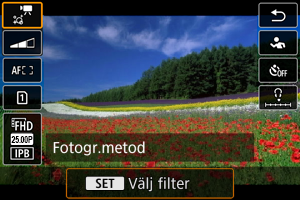 | Du kan ställa in slutartid, bländarvärde och ISO-tal manuellt för filminspelning. | ||