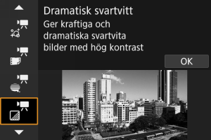 I metoden (kreativa filter) kan du spela in filmer med en av fem filtereffekter tillämpade. Dröm, gamla filmer, minne, dramatisk svartvitt och miniatyreffekt-filmer.