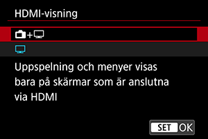 Kamerafunktioner såsom bildvisning och menyvisning visas på den andra enheten via HDMI och inte på kamerans skärm.