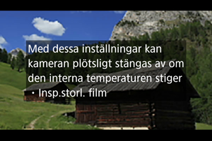 Vägledningen varnar för att kameran kan bli internt varm om filmer spelas in med de aktuella inställningarna och att kameran kan komma att stängas av automatiskt om du fortsätter spela in.