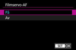 När funktionen är aktiverad fokuserar kameran kontinuerligt på motivet vid filminspelning.