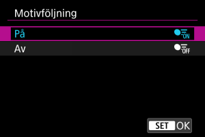 Att välja ett annat alternativ än [Inget] visar en spårningsram [] för det detekterade huvudmotivet. Spårningsramen flyttas för att spåra motiv som börjar röra på sig.