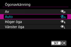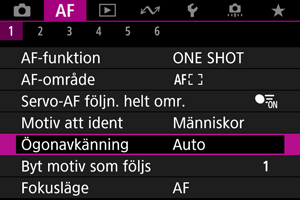 Du kan fotografera med motivets ögon i fokus genom att ställa in [: Ögonavkänning] till ett annat alternativ än [Av] ().