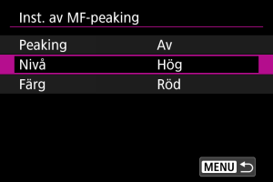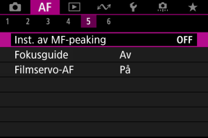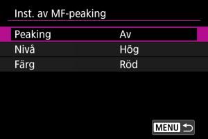 - MF-peaking kan vara svår att urskilja vid höga ISO-tal, särskilt när utvidgat ISO är inställd. Sänk om nödvändigt ISO-talet eller ställ in [Peaking] på [Av].