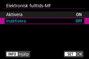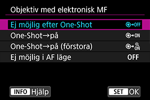 För objektiv utrustade med elektronisk manuell fokusering kan du ange hur manuell fokusjustering ska användas med One-Shot AF.