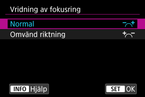 - Den här menyn visas inte om objektiv med en brytare för fokus/kontrollringen används. Använd objektivet för att konfigurera funktionalitet på fokus/kontrollringen.