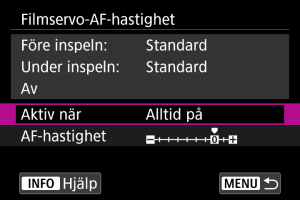 Du kan ställa in [Alltid på] så att AF-hastigheten alltid aktiveras för filminspelning (före och under filminspelning) eller ställa in [Under inspelning] så att AF-hastigheten bara aktiveras vid filminspelning.