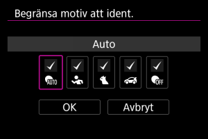 Du kan begränsa de tillgängliga inställningsalternativen i [: Motiv att ident] till dina önskade alternativ. Välj ett alternativ att utesluta och tryck på knappen