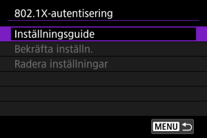 Att välja [802.1X-autentisering] låter dig ställa in, kontrollera eller radera 802.1X-autentiseringsinställningar med hjälp av en installationsguide.