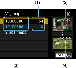 - En mapp kan innehålla upp till 9999 bilder (filnummer 0001–9999). När en mapp blir full skapas automatiskt en ny mapp med löpande numrering. Dessutom skapas en ny mapp automatiskt om manuell återställning () utförs. Mappar från 100 till 999 kan skapas.