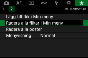 Du kan ta bort alla flikar i Min meny som har skapats. När du väljer [Radera alla flikar i Min meny] kommer alla flikar från [MY MENU1] till [MY MENU5] att raderas och []-fliken återgår till sin grundinställning.