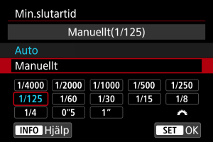För att förhindra att slutartiderna ställs in för lågt automatiskt kan du ställa in minsta slutartid för ISO Auto.