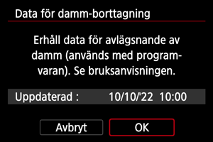 Kameran lägger till de data för dammborttagning som hämtas till alla bilder från och med nu. Att hämta data för dammborttagning direkt före bildtagning rekommenderas.