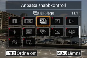 - Välj [Återställ inställningar] för att återställa standarposterna och -layouten för snabbkontrollskärmen.