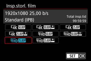 Du kan ställa in inspelningsstorlek, bildhastighet och komprimeringsmetod i [: Insp.storl. film].