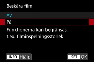 - Filmer med hög bildhastighet kan inte spelas in med beskärning.