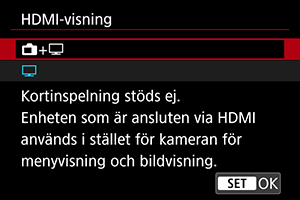 Kamerafunktioner såsom bildvisning och menyvisning visas på den andra enheten via HDMI och inte på kamerans skärm.