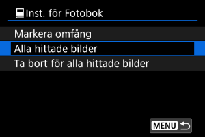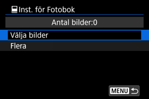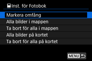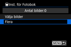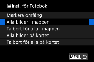 Alla bilder i mappen eller på kortet anges för fotoboken när du väljer [Alla bilder i mappen] eller [Alla bilder på kortet] i alternativet [Flera] för [: Inst. för Fotobok].