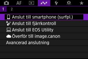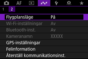 Om du föredrar att inte förbli ansluten till kameran via Wi-Fi eller Bluetooth till kameran när den är avstängd kan du antingen ställa in [: Flygplansläge] till [På] eller ställa in [