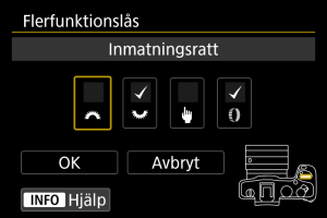 Ange vilka kamerakontroller som ska låsas när flerfunktionslåset är på. Detta kan förebygga att du ändrar inställningar av misstag.
