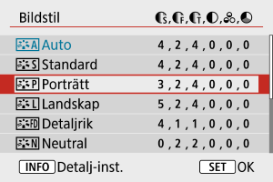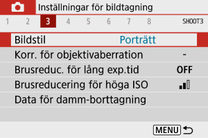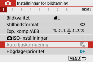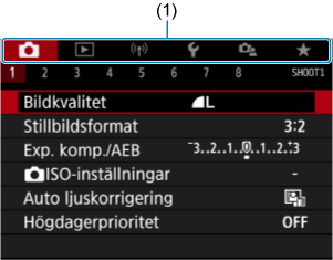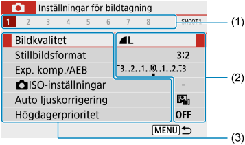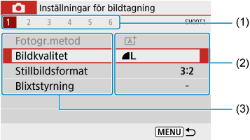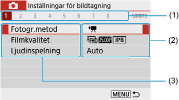 Menyflikarna och -alternativen som visas varierar beroende på fotograferingsmetoden.