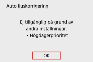 Nedtonade menyalternativ kan inte väljas. Menyalternativet är nedtonat om en annan funktionsinställning åsidosätter det.