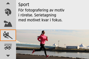 Använd läget [] (Sport) för att fotografera motiv i rörelse såsom löpare eller fordon.