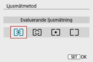 Det finns fyra metoder (ljusmätmetoder) för mätning av motivets ljusstyrka. Normalt rekommenderas evaluerande ljusmätning. Evaluerande ljusmätning ställs in automatiskt i baszonens lägen (utom i läget :