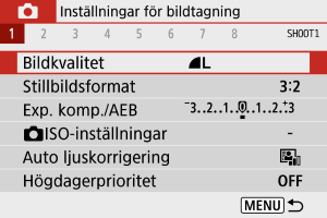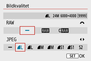 - Om du väljer både RAW och JPEG varje gång du fotograferar, registreras samma bild samtidigt på kortet både som både RAW- och JPEG-bilder med dina indikerade bildkvaliteter. De två bilderna sparas med samma filnummer (filtillägg: .JPG för JPEG och .CR3 för RAW).
