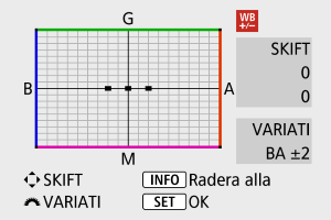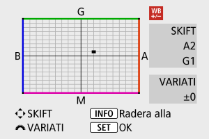 B står för blå, A för gul, M för magenta och G för grön. Vitbalansen korrigeras i den riktning du flyttar märket.
