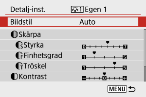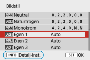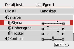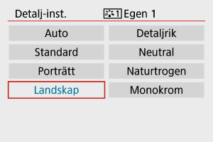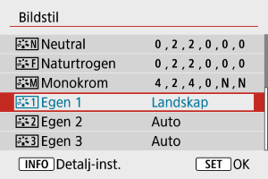 Du kan välja en bildstil såsom [Porträtt] eller [Landskap] samt justera den efter önskemål och registrera den under [Egen 1] – [Egen 3]. Användbart när du skapar flera bildstilar med olika inställningar.