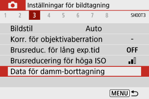 Data för dammborttagning som används för att ta bort dammfläckar kan läggas till på bilder. Data för dammborttagning används av Digital Photo Professional (EOS-programvara) för att automatiskt ta bort dammfläckar.