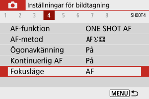 : Fokusläge] visas inte när fokuspositionen är inom räckvidden endast för manuell fokusering (MF). Vrid på fokuseringsringen mot oändligheten (moturs, sett från kamerans framsida) för att flytta fokuspositionen till [