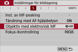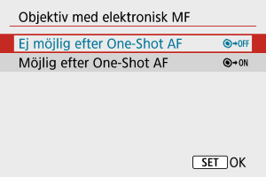 För objektiv utrustade med elektronisk manuell fokusering kan du ange hur manuell fokusjustering ska användas med One-Shot AF.