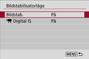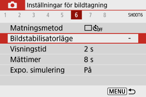 Bildstabilisering av objektivet reducerar kameraskakning vid fotografering. För att aktivera objektivets IS när du använder IS-objektiv utan IS-omkopplare kan du sätta [Bildstab.] till [På] enligt följande. Observera att inställningen [Bildstab.] inte visas när du använder IS-objektiv som har en IS-omkopplare. I så fall kan du ställa objektivets IS-omkopplare till för att aktivera stabilisering av objektivet.