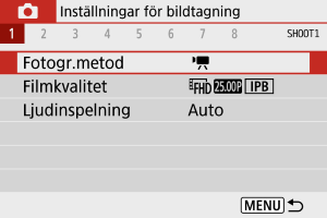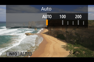 Du kan ställa in ISO-talet manuellt eller välja []. Mer information om ISO-tal finns på ISO-tal under filminspelning.