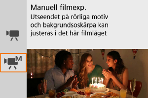 Du kan ställa in slutartid, bländarvärde och ISO-tal manuellt för filminspelning.