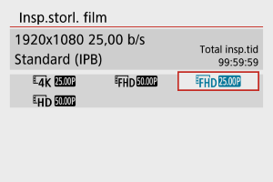Se Beräknad inspelningstid, filmbithastighet/filstorlek för information om tillgängliga filstorlekar och inspelningstider vid respektive filminspelningsstorlek.