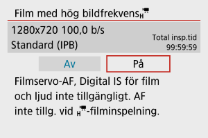 Du kan spela in HD-filmer med en hög bildhastighet på 119,88 eller 100,00 b/s genom att ställa in [Hög bildfrekvens] i [: Filmkvalitet] till [På]. Det här är idealiskt när du spelar in filmer som ska spelas upp i slow motion.