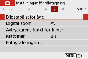 Kamerans funktion Digital IS för film reducerar kameraskakning vid filminspelning. Digital IS för film kan ge effektiv stabilitet även om objektivet inte är utrustat med en Image Stabilizer (Bildstabilisator). När du använder ett objektiv med Image Stabilizer (Bildstabilisator) ska objektivets omkopplare för Image Stabilizer (Bildstabilisator) ställas in på .