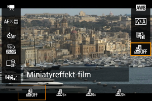 Att göra bildområden oskarpa utanför ett valt område låter dig spela in filmer med en miniatyrmodelleffekt tillämpad. Du kan även välja en uppspelningshastighet innan du spelar in för att göra filmer som liknar miniatyrscener med människor och föremål som rör sig i snabb rörelse. Observera att ljud inte spelas in.