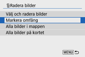 När du tittar på bilderna i indexvisning kan du ange den första och sista bilden i ett omfång för att genast radera alla angivna bilder.