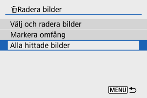 - Om du väljer [Alla hittade bilder] raderas alla bilder som filtrerats med hjälp av sökkriterierna.