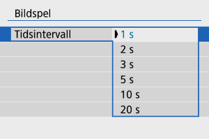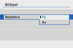 - Ställ in inställningarna [Tidsintervall], [Repetera] (upprepad visning) och [Övergångseffekt] (effekt vid bildbyte) för stillbilderna.