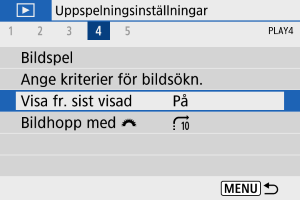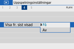 - [På]: Bildvisningen återupptas från den sist visade bilden (förutom om du just har avslutat fotograferingen).