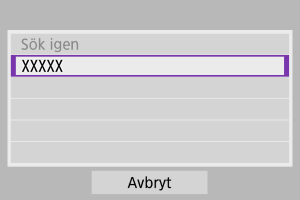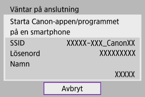 - På din smartphones inställningsskärm för Wi-Fi kan du trycka på SSID (nätverksnamn) som visas på kameran och sedan ange lösenordet för åtkomstpunkten för anslutningen.