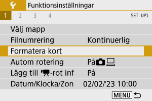 Om kortet är nytt eller tidigare har formaterats (initierats) med en annan kamera eller med en dator formaterar du kortet med den här kameran.