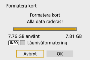 Vid lågnivåformatering kan du avbryta formateringen genom att välja [Avbryt]. Den vanliga formateringen är redan klar och du kan använda kortet som vanligt.
