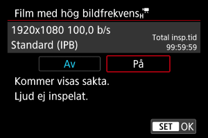 När Hög bildfrekvens har ställts in till [På] kan videokameran registrera 119,88/100,00 b/s för att spela in videofiler med en bildfrekvens på 29,97/25,00 b/s.