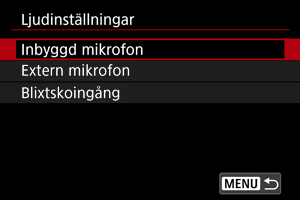 Konfigurera mikrofonerna som används vid filminspelning. När externa mikrofoner används ska du se till att även läsa användarhandboken för den externa mikrofonen.